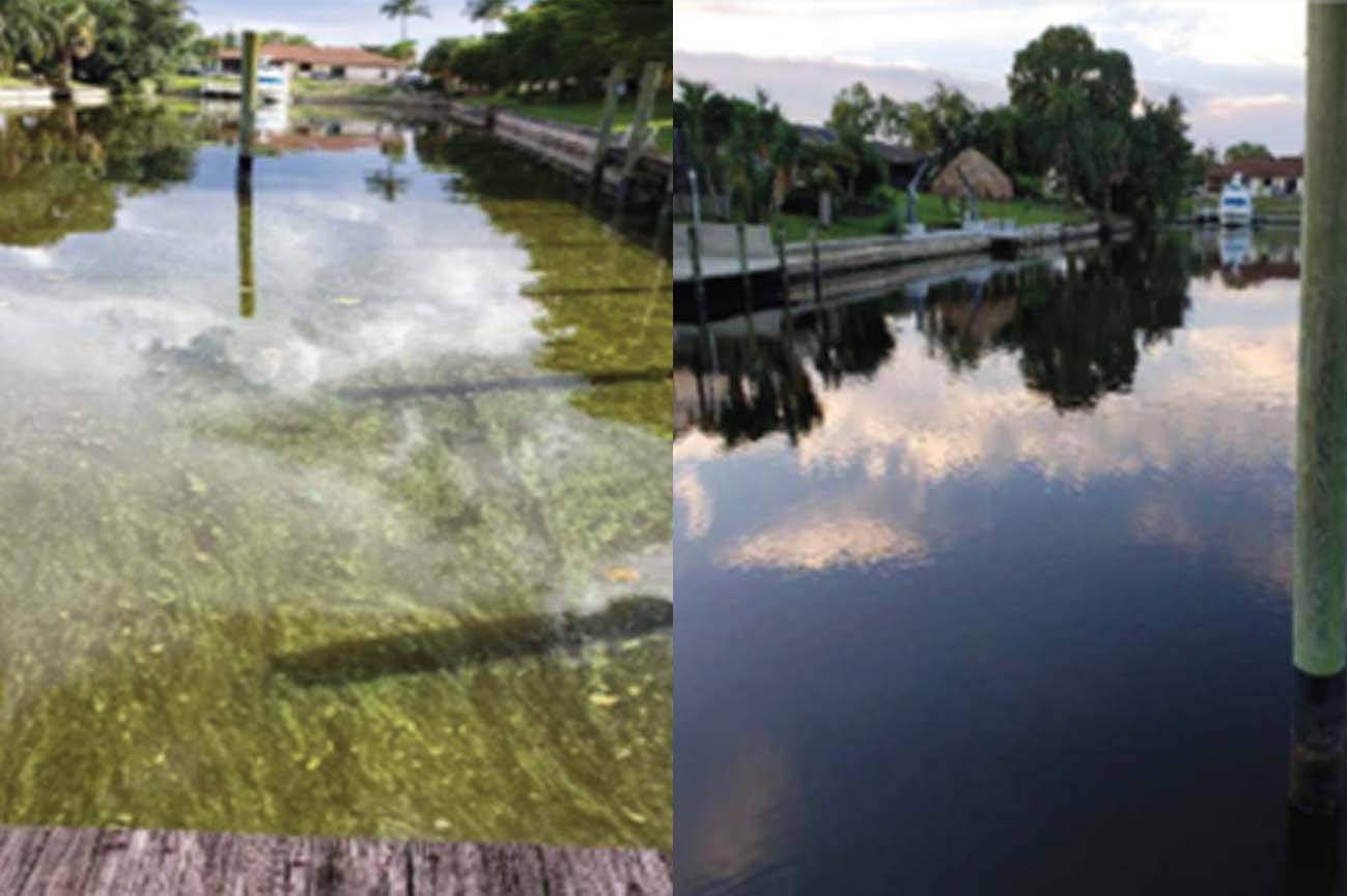 Visual elimination of algal bloom over 4 days with DO before treatment 3.2ppm; after treatment 12ppm